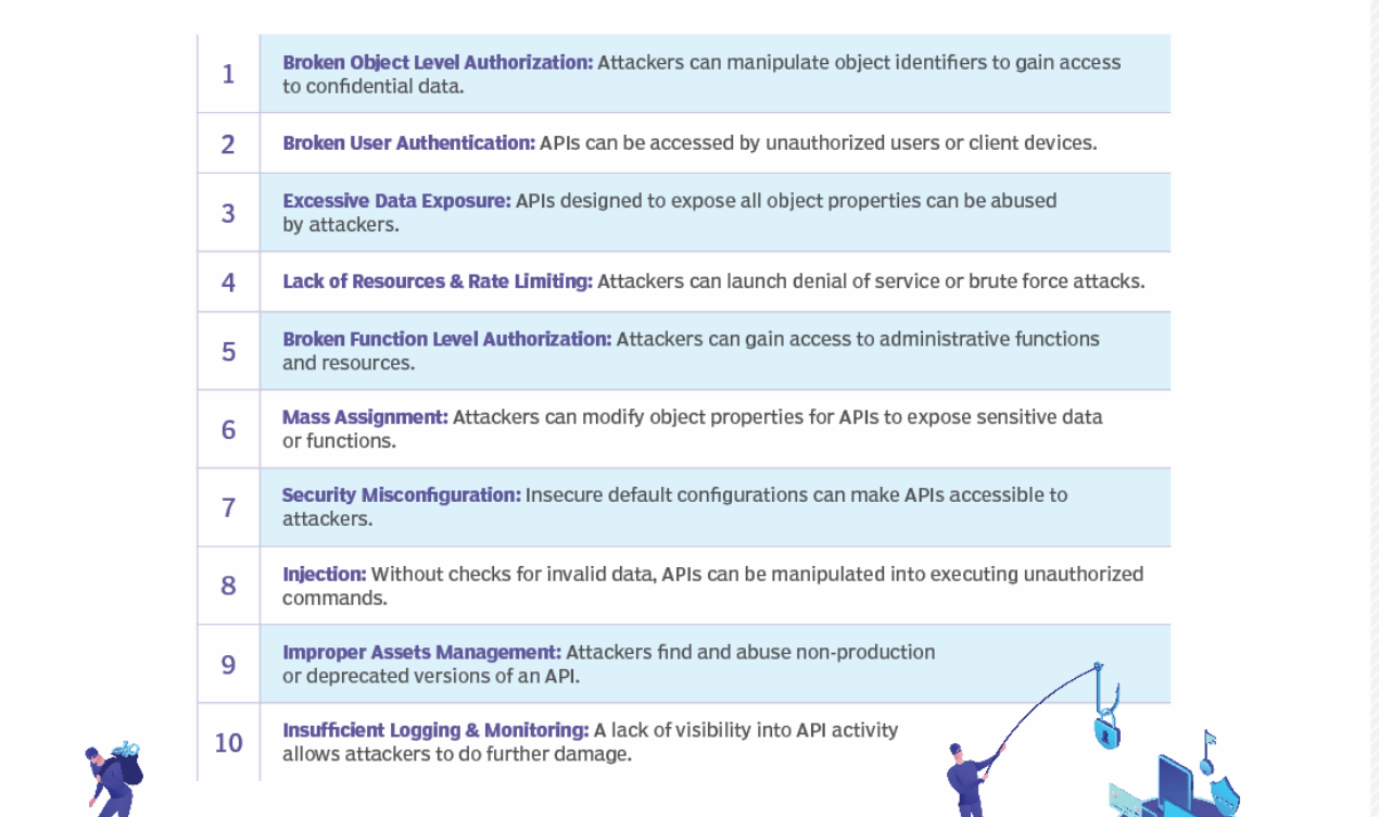 - Karena didorong oleh standardisasi, API juga rentan terhadap serangan siber terkait paparan data, autentikasi pengguna, otorisasi tingkat objek dan fungsi, penugasan massal, dan serangan injeksi.